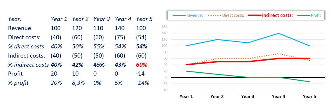 This is a visualisation of the above scenarios – the increase in Indirect costs created a ‘step’ in costs and the step dented your profit:
