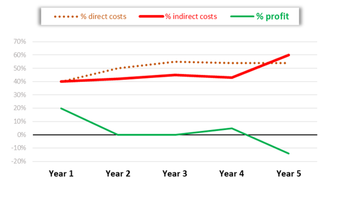 Second, you want the percentage of Indirect costs to go down year on year, like in Year 4 above